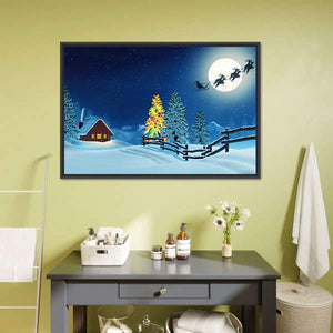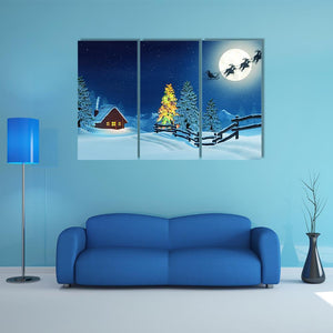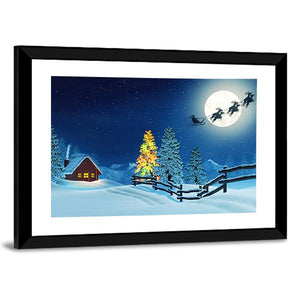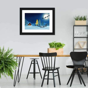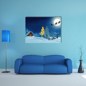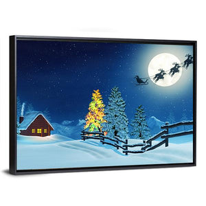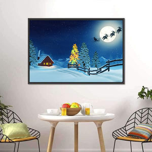 Cabin In A Moonlit Snowy Christmas Landscape captures a quiet winter scene with a cabin, a glowing Christmas tree, and Santa’s sleigh beneath a full moon and stars. The blues, whites, soft yellow moonlight, and touches of green create a festive, nighttime mood. It pairs well with traditional or holiday-themed decor.
