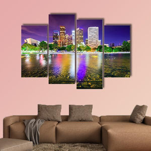 California Downtown City Skyline shows a vibrant downtown skyline at night, with colorful building lights reflected on the water. Its purple, blue, yellow and green palette creates an energetic, modern mood that works well in contemporary living rooms or offices.