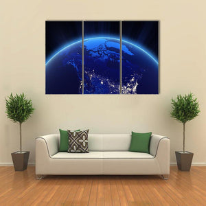 Canada From Space shows Canada and nearby North America at night, with the continent outline traced by glowing city lights. The blue, black, white and yellow palette gives a vast, awe-inspiring, glowing atmosphere in a modern, realistic style. Suited to modern home decor and contemporary rooms that favor map-inspired art.