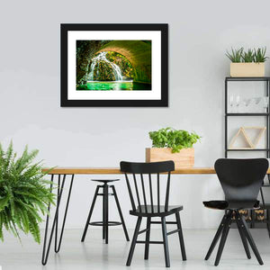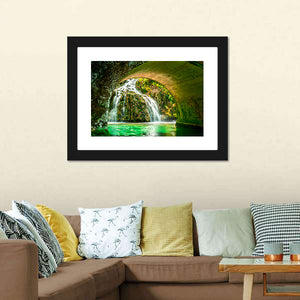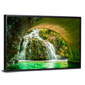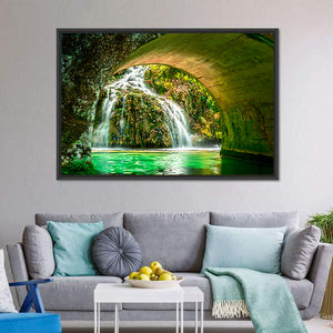 Cascade of Orbaneja Del Castillo captures a serene, refreshing waterfall flowing beneath a stone arch, with water tumbling over mossy rocks and surrounded by lush green foliage. This spring scene brings a calm, natural feel that suits modern or nature-inspired rooms.