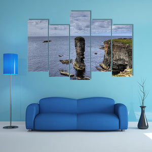 This canvas wall art captures the dramatic beauty of Yesnaby Castle, featuring a tall sea stack surrounded by jagged rocks and vibrant cliffs. The serene blues and greens evoke a natural, calming atmosphere, making it a stunning addition to any landscape art collection.