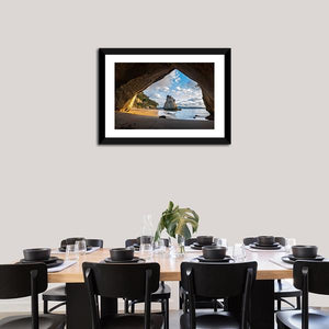 Experience the serene beauty of a coastal cave as sunlight streams through, illuminating footprints on the sandy floor. This photorealistic piece captures the calming palette of blues, browns, and greens, bringing a touch of nature into your home.