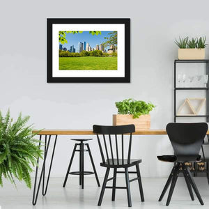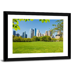 This canvas captures a serene view of Central Park, featuring lush green grass and vibrant trees beneath a blue sky. With a wide-angle perspective, it beautifully frames the city skyline, offering a peaceful escape into urban nature.