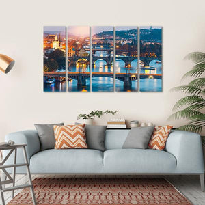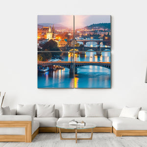 This canvas wall art features the iconic Charles Bridge spanning the Vltava River, capturing the serene yet bustling atmosphere of an evening in the Czech Republic. With a mix of blue, gold, and city lights reflecting on the water, it brings a beautiful cityscape to life.