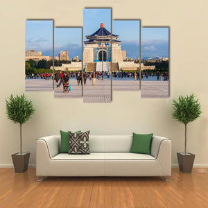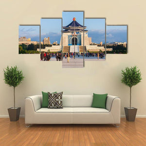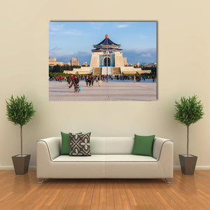 This canvas art features the iconic Chiang Kai-shek Memorial Hall, captured in a grand and busy atmosphere. The vibrant blue tiled roof and crowds against a backdrop of white and gray enhance the architectural beauty, making it a striking addition to any decor.