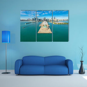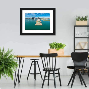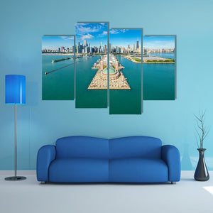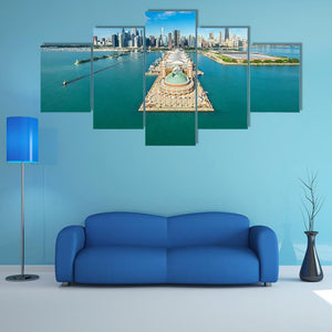 This canvas artwork captures a striking aerial view of the Chicago skyline, featuring Navy Pier and Lake Michigan. With its vibrant blues and greens, it evokes a sunny and expansive atmosphere, making it a beautiful addition to any wall decor.