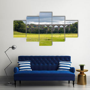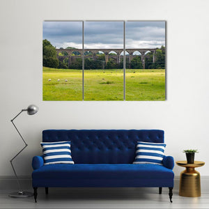 This captivating landscape features a stone viaduct gracefully arched over a serene green field dotted with fluffy sheep. With a palette of calming greens and browns against the backdrop of a cloudy sky, it evokes a pastoral and historic mood, perfect for adding a touch of nature to your decor.