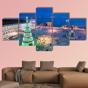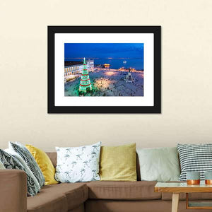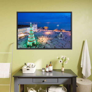 Aerial cityscape of a large illuminated Christmas tree in a waterfront plaza, captured in realistic twilight tones. Crowds, calm water and distant buildings with blue, green, white, red and yellow lights create a festive, lively evening scene. Suits modern living spaces and city-inspired room decor.
