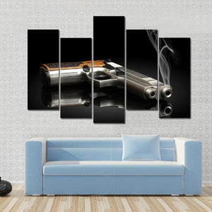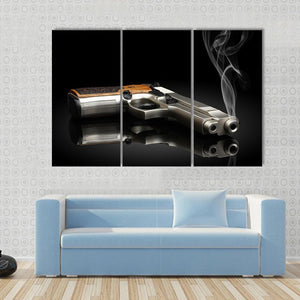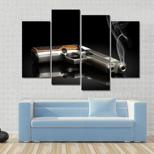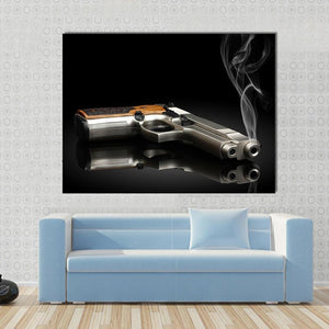 This striking wall art features a chrome handgun, with smoke rising to evoke an intense and powerful mood. Its modern, realistic style brings a touch of edginess to your space, making it a bold statement piece.