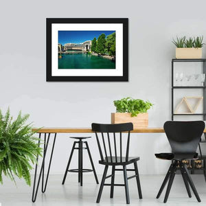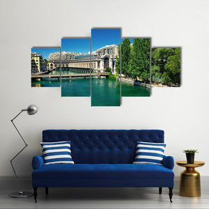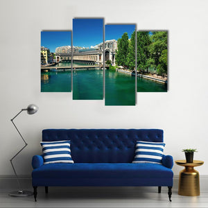 This canvas artwork captures a serene cityscape of Geneva featuring a river, bridge, and lush trees. Its bright palette of blues and greens brings a vibrant touch to any space.