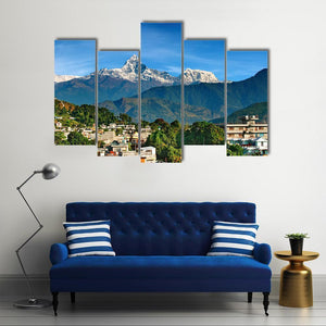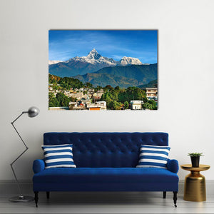 This photorealistic landscape captures the majestic beauty of Pokhara, featuring a stunning snow-capped mountain peak, green rolling hills, and a vibrant blue sky. Its serene atmosphere makes it an ideal addition to any wall decor.