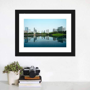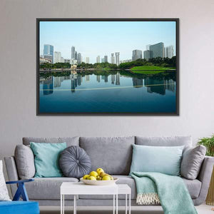 This canvas art captures a serene cityscape, showcasing skyscrapers reflected in calm water. The modern palette of blue, white, and green adds a tranquil touch, making it a great fit for contemporary room decor.