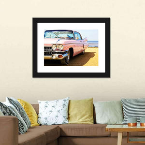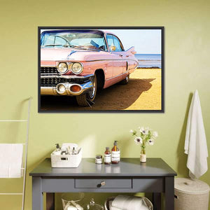 A close-up, eye-level view of a pink vintage car set against a beach and ocean backdrop. The retro palette of pink, blue, tan and chrome gives a nostalgic, summery feel, suitable for coastal, vintage-inspired, or modern rooms.