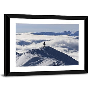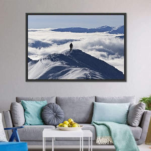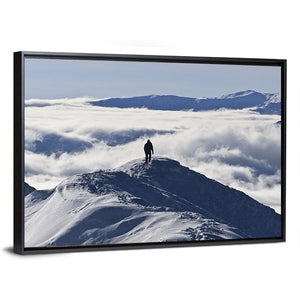 This captivating canvas art features a lone skier navigating a snowy mountain ridge under a vast sky. The serene blues and grays create an adventurous atmosphere, making it a striking addition to any nature-inspired décor.