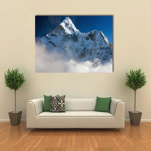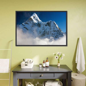 This canvas features the majestic Ama Dablam peak, surrounded by fluffy clouds against a clear blue sky. Its photorealistic style captures the serene beauty of nature, making it a stunning addition to any modern decor.
