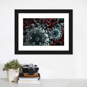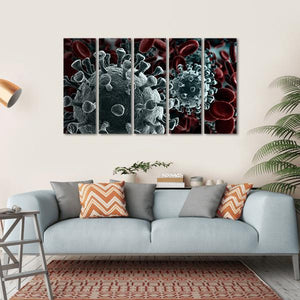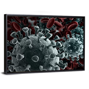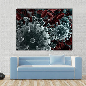 This canvas art features a close-up view of virus particles alongside red blood cells. The scientific and ominous mood, with its gray and black palette, adds depth and intrigue, making it a striking choice for modern decor.