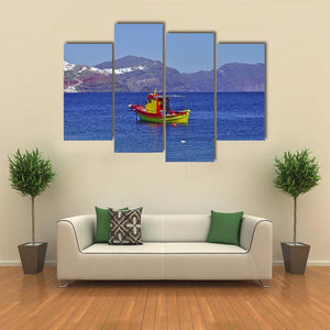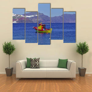 This canvas features a vibrant fishing boat gently floating on a serene ocean, framed by majestic snow-capped mountains. The bright blue, yellow, and red palette creates a peaceful and sunny atmosphere, making it an ideal addition to any landscape lover's decor.