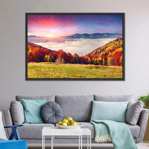 This canvas art features the serene Carpathian Mountains enveloped in fog, showcasing vibrant autumn foliage under a sunset sky. The rich palette of reds, oranges, and purples creates a majestic atmosphere, making it a beautiful addition to any nature-inspired decor.