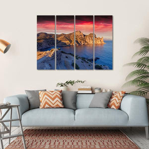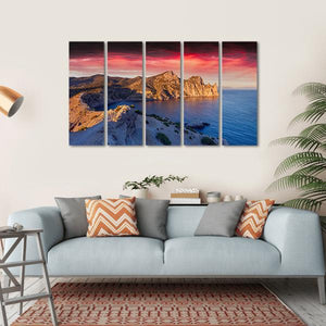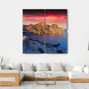 This canvas captures a serene sunrise over the rocky coastline of Crimea, showcasing the dramatic cliffs and ocean. With its vibrant blue and warm orange hues, it brings a peaceful, natural touch to any space.
