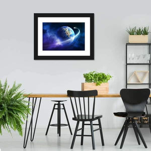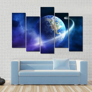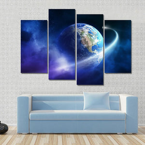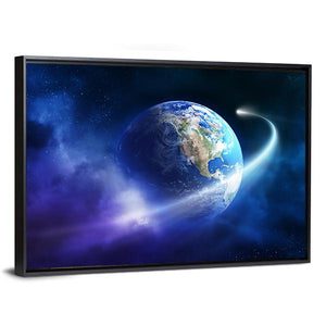This canvas art captures a stunning view of Earth with a glowing comet soaring through a cosmic space scene. The dramatic blue and purple hues evoke feelings of awe and wonder, making it a striking addition to modern decor.