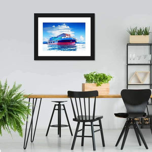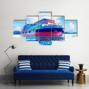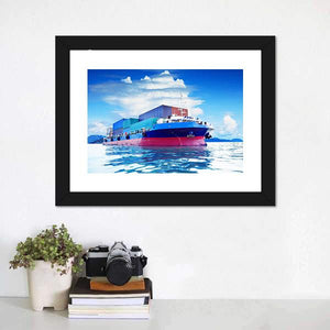 A realistic canvas print of a commercial container ship at sea, showing stacked cargo containers under a calm sky. Its blue, red, white and green palette creates a quiet, expansive mood that suits modern home or office wall decor.