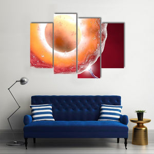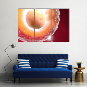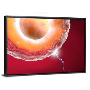 A close-up study of fertilization, this canvas shows an ovum with a textured outer membrane and a sperm with a distinct head and tail. Rendered in orange, yellow, red and blue, the work feels scientific and conceptual and suits medical offices, study areas, or modern home interiors drawn to science-inspired art.
