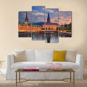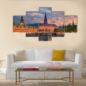 This canvas features a serene cityscape of Copenhagen, showcasing its historic buildings, canals, and iconic spires at twilight. The vibrant palette of blues, oranges, pinks, and golds captures the picturesque atmosphere, enhanced by reflections in water and dramatic clouds.