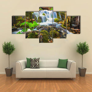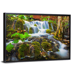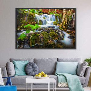 This canvas wall art features a tranquil waterfall cascading over mossy rocks, surrounded by a serene forest. The artwork’s calming colors of green, brown, and blue invite a sense of peace, making it a beautiful addition to any nature lover's decor.