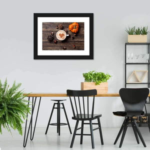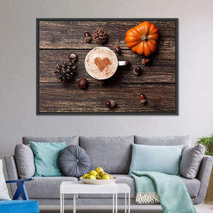 This cozy, autumnal canvas features a coffee cup and a pumpkin, set against a rustic wooden background. The warm palette of brown, orange, and cream creates a welcoming vibe, perfect for bringing fall warmth into your space.