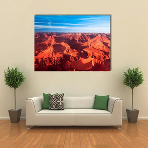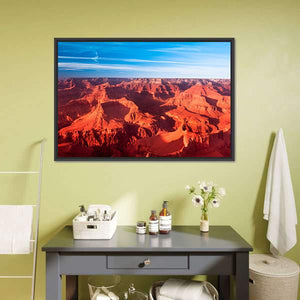 This canvas artwork showcases the majestic Grand Canyon, with vibrant red and orange hues reflecting a serene sunset. The aerial view captures layered rock formations and wispy clouds, making it a stunning addition to any modern landscape décor.