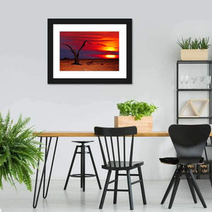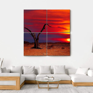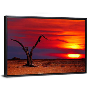 This canvas art captures a dramatic scene of a gnarled dead tree set against the backdrop of a stunning desert sunset. The vibrant palette of reds, oranges, and purples evokes a serene yet arid atmosphere, making it a unique addition to any wall.