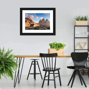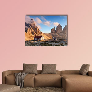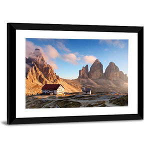 Dolomites Mountain At Sunset shows two mountain huts beneath dramatic peaks and a partially cloudy sky, arranged with a rule-of-thirds composition. The blue, brown, white and soft orange palette gives a peaceful, serene, isolated feeling that suits rustic or nature‑inspired rooms.