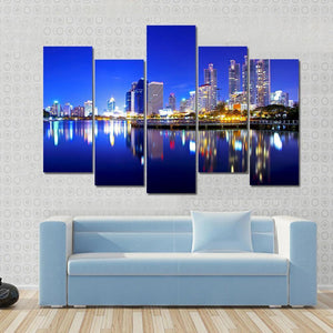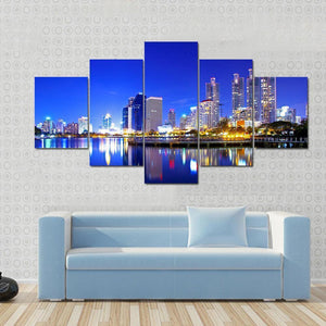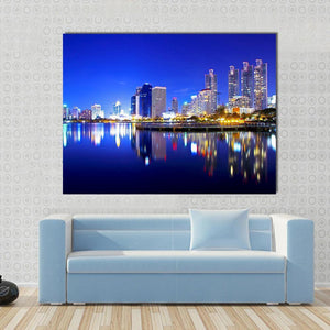 Capture the vibrant essence of Bangkok with this stunning cityscape. Featuring a striking skyline and serene reflections on the water, this artwork brings an urban touch to your space, perfect for any modern décor.