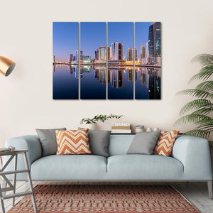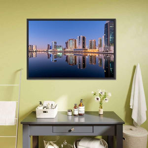 This modern canvas art features a calm scene of Dubai's skyline, reflecting beautifully in the canal waters. With a palette of blue, white, and gold, it adds sophistication to any space.