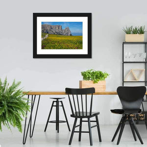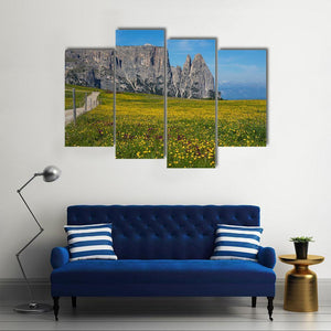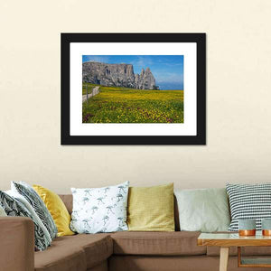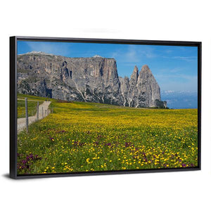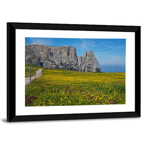 Alpe Di Siusi in South Tyrol presents a realistic mountain landscape with a flower field, rocky formations, and a gravel path that leads into the scene. The rule-of-thirds composition and green, yellow, blue and grey palette create a serene, picturesque, and vibrant mood — a calm focal piece for modern living rooms or bedrooms.