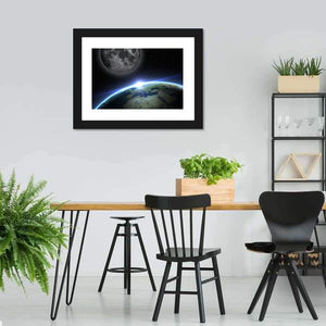Experience the serene beauty of the Earth and Moon with this captivating canvas art. Featuring a stunning portrayal of Earth with visible continents and craters on the Moon against a starry backdrop, it evokes a sense of awe and vastness, making it a perfect addition to any space lovers' decor.