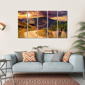 This canvas art captures a serene mountain road at sunset, framed by a rustic wooden fence. The warm hues of orange and purple create a dramatic yet peaceful atmosphere, making it a wonderful addition to any nature-inspired décor.