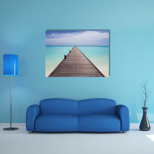 Experience the tranquil beauty of a wooden pier stretching into the clear turquoise waters of the Maldives. The serene blues and browns create an expansive atmosphere, capturing a moment of peace under a partially cloudy sky.