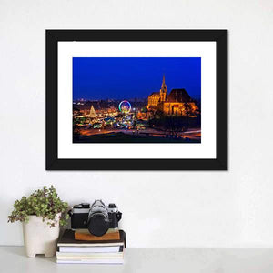 Erfurt Christmas Market Canvas shows a high-angle cityscape of a bustling Christmas market with a tall church spire and a ferris wheel. Blue evening tones meet warm golden lights for a festive, illuminated scene. Suited to modern living rooms or entryways looking for city-inspired seasonal wall decor.