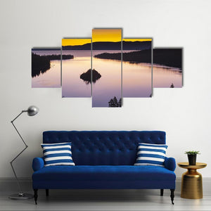 Evening At Lake Tahoe captures a quiet lakeside sunset with an island, silhouetted trees and distant mountains. The photographic canvas uses warm yellow, purple, dark green and orange tones to create a serene, peaceful mood that fits modern living rooms or bedrooms.