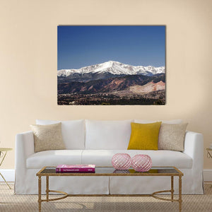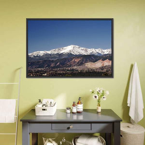 This canvas shows snow-capped mountains above a dense pine forest and a small town beneath a clear blue sky. The realistic, wide-shot composition feels serene and majestic, with layers of blue, green, white and hints of red earth. It suits modern interiors as a calm landscape focal point.