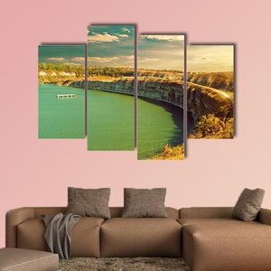 Fall River Canyon Canvas Wall Art captures a wide, panoramic view of a quarry lake beside a rock-strewn cliff under a bright sky. Soft blues, greens and tan highlights, with small floating structures on the water and clouds above, give the scene a natural, realistic feeling that is serene and open. It fits well in modern or nature-inspired rooms as a calm focal artwork.