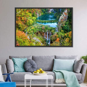Experience the serene beauty of autumn with this vibrant landscape featuring cascading waterfalls, a multi-tiered lake system, and lush forests. Perfect for adding a touch of nature’s majesty to any space.