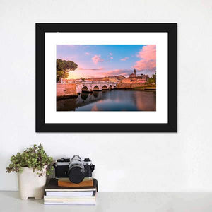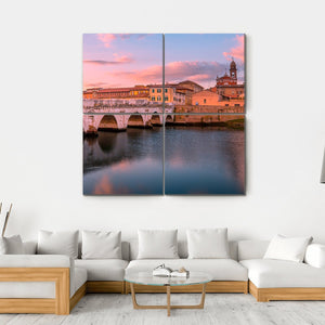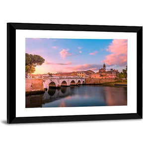 This canvas art beautifully captures the Famous Bridge in Rimini, Italy, framed by a serene river and a warm, romantic sky. The striking palette of blues, pinks, and oranges evokes a peaceful atmosphere, making it a perfect addition to any wall.