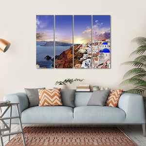 Experience the charm of Santorini with this vibrant canvas wall art, capturing the picturesque coastal town at sunset. The artwork features striking white buildings with blue domes against a backdrop of rocky cliffs and a calm sea, creating a serene atmosphere perfect for any room.