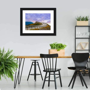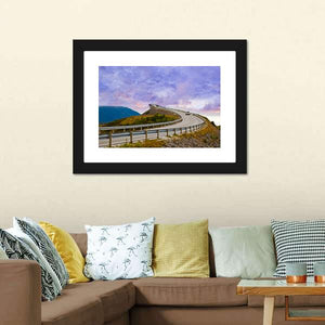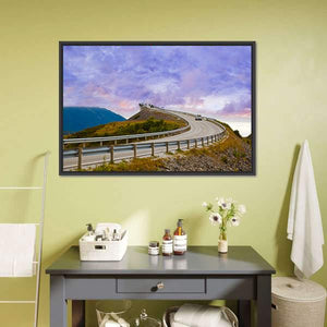 Bridge On Atlantic Road Canvas Wall Art depicts a winding coastal road and bridge running between mountains and the ocean beneath dramatic clouds. The realistic scene uses cool blues, purples, greens and grays to create a scenic, adventurous mood that suits modern or travel-themed rooms.