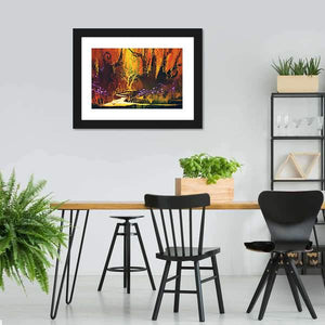 Explore a whimsical forest scene with a playful tree, winding paths, and vibrant flowers. The rich palette of orange, yellow, and purple creates a magical, serene atmosphere, making it a delightful addition to any cozy space.