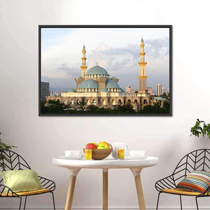 This canvas art captures the majestic Wilayah Mosque with its grand minarets and domes, set against a serene landscape of blue skies and soft clouds. The symmetrical architecture reflects a peaceful vibe, making it a perfect addition to your home decor.