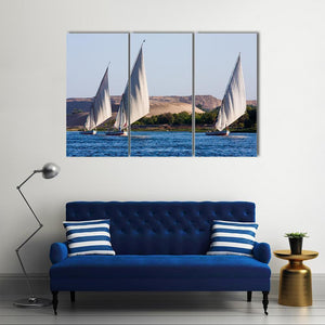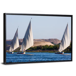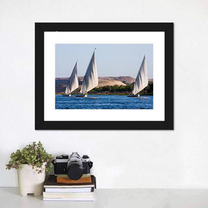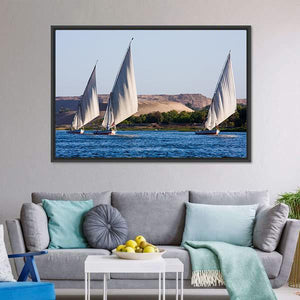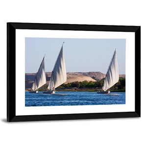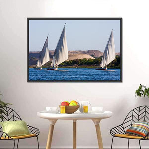 This captivating landscape features serene feluccas sailing on the tranquil Nile River, surrounded by lush greenery and desert dunes. The peaceful palette of blue and white evokes a sense of calm, making it a perfect addition to your wall decor.
