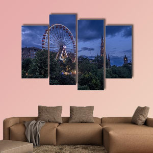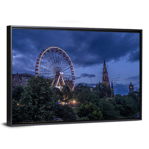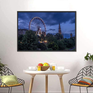 This photorealistic canvas captures an illuminated ferris wheel beside a church steeple and trees beneath dark stormy clouds in Scotland. Rendered in blues, greens, white, and hints of yellow, it carries an atmospheric, dramatic, and enchanting mood that suits modern living rooms or entryways.